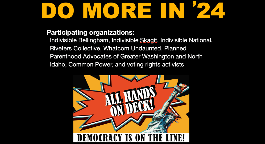 Indivisible Vashon has created an amazing matrix of actions you can take from your armchair and contribute your time, energy, and/or your dollars for the fight to save democracy. Be sure to check out their 2024 Battleground States Matrix.
