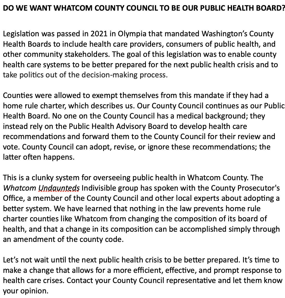 The Whatcom Undaunteds Indivisible group is championing an amendment of the county code to streamline healthcare policy in Whatcom County. Currently the Whatcom County Council serves as our Public Health Board, while no council member has a medical background. We must be prepared for the next health crisis, so contact your County Council member and express your opinion.