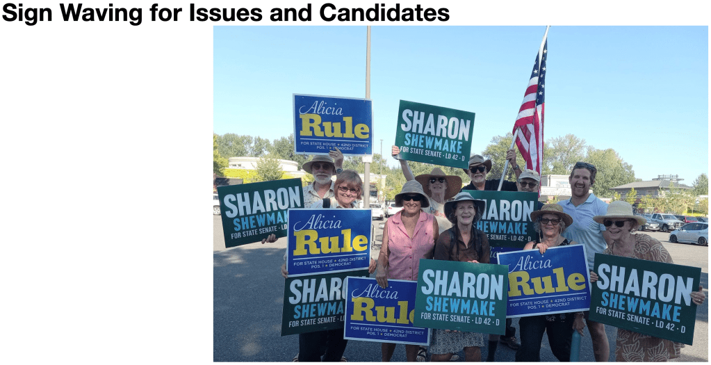 Indivisible Bellingham has participated in this volunteer effort for candidates and issues for several years. If you’re interested, we usually gather on a busy street corner and spend an hour waving signs and flags at passers-by, eliciting honks of approval. If you’d like to be alerted when we plan on one of these fun activities, just email us, mention sign waving and your contact info., and we’ll reply. : IndivisibleBellingha@gmail.com.