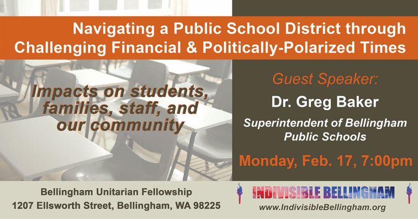 Indivisible Bellingham’s February All Hands meeting (Monday, Feb. 17) featured Bellingham Public Schools Superintendent, Dr. Greg Baker.