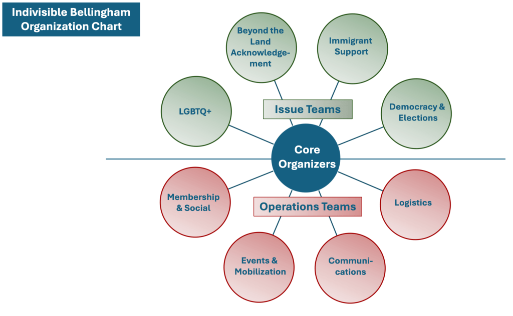 We are using the Snowflake model of community organizing that is being implemented across the country as groups respond to an authoritarian takeover. The new structure has two main areas OPERATIONS and ISSUES. The individual groups shown are just the beginning and not to be viewed as an end point. As leaders and organizers step up we anticipate more issues groups and additional expansion of our operations teams.